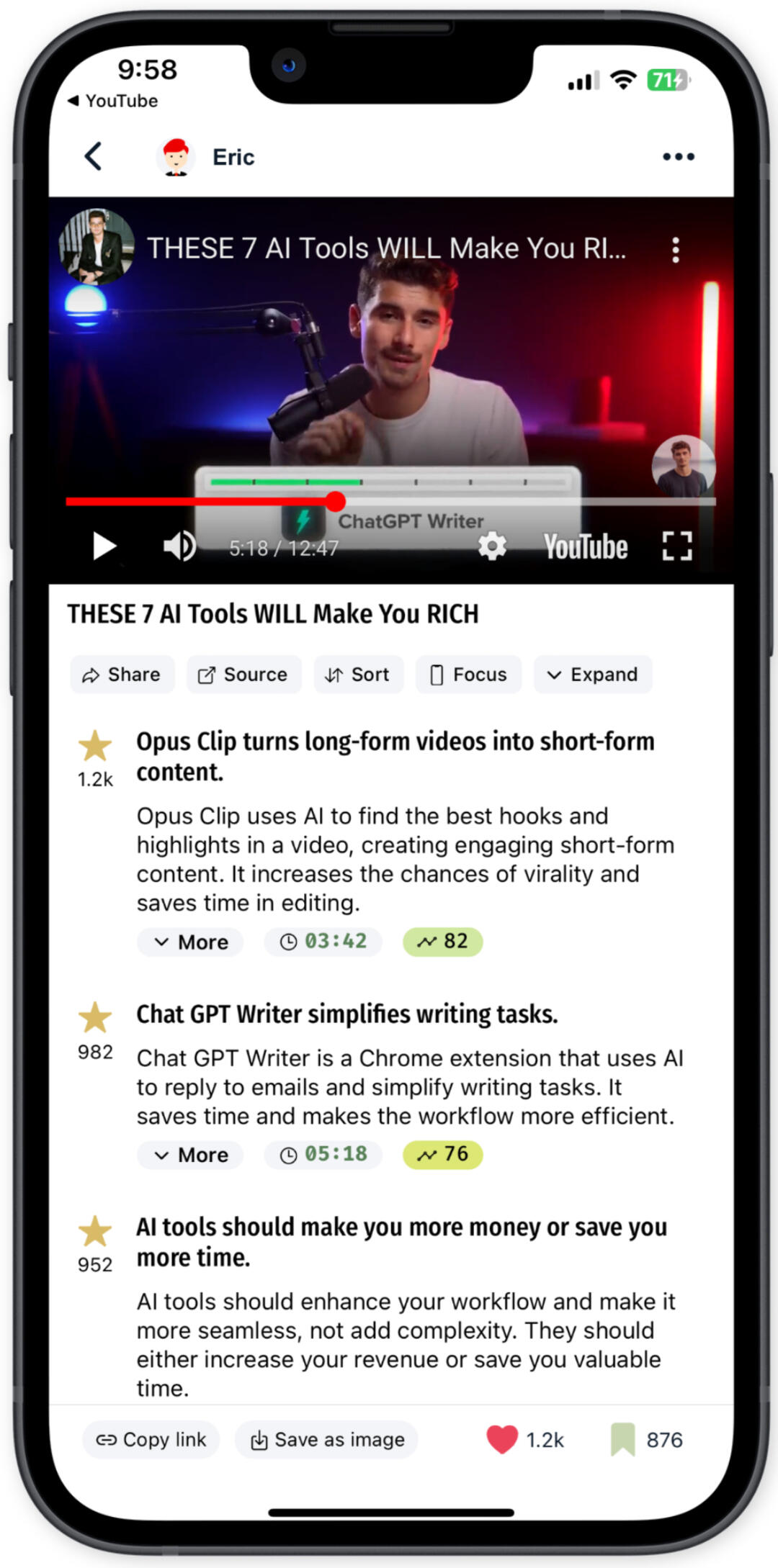 Watch video and jump to moments: You can watch the source YouTube video inside the app, and jump to the timestamp of a takeaway instantly.